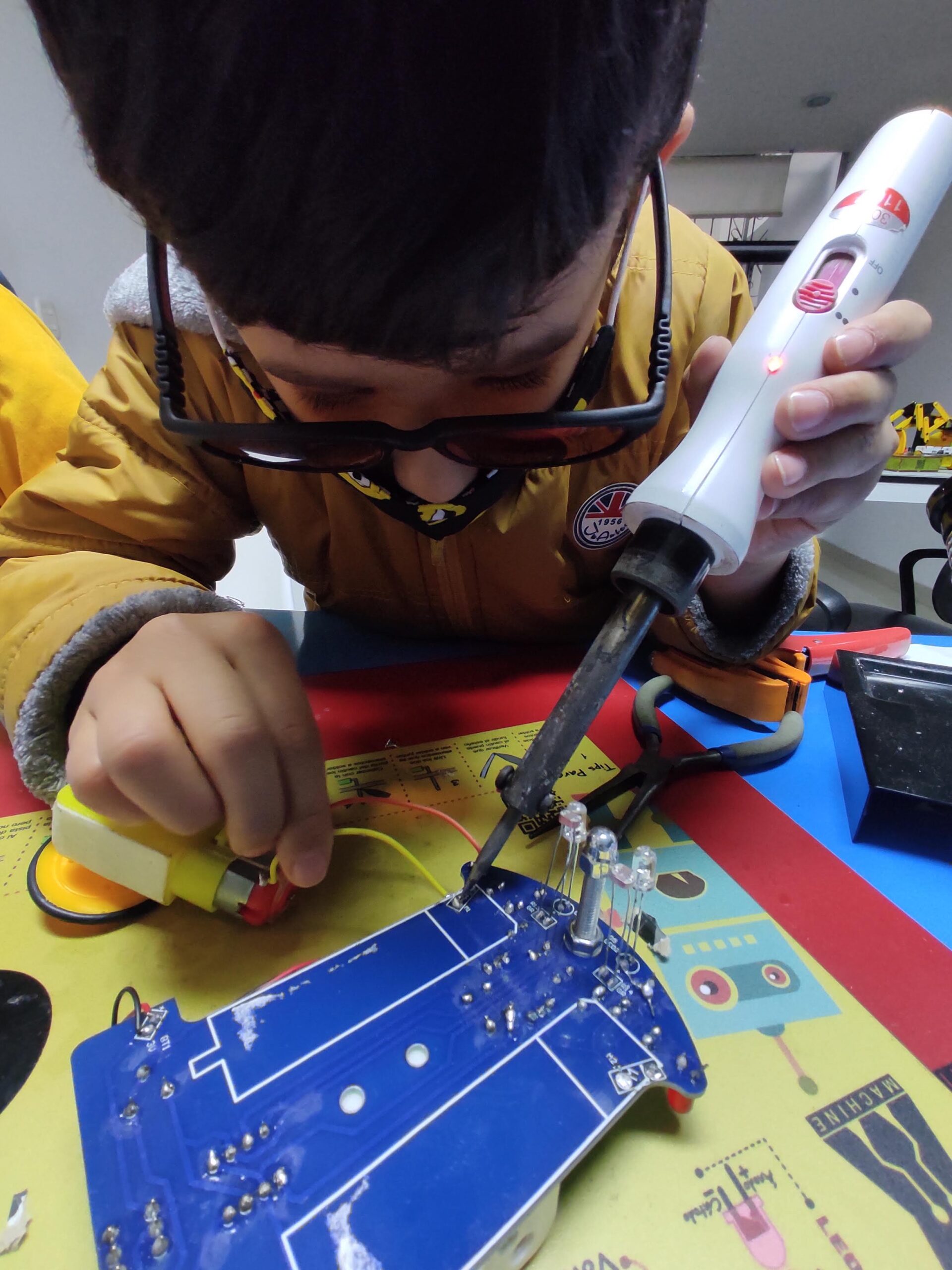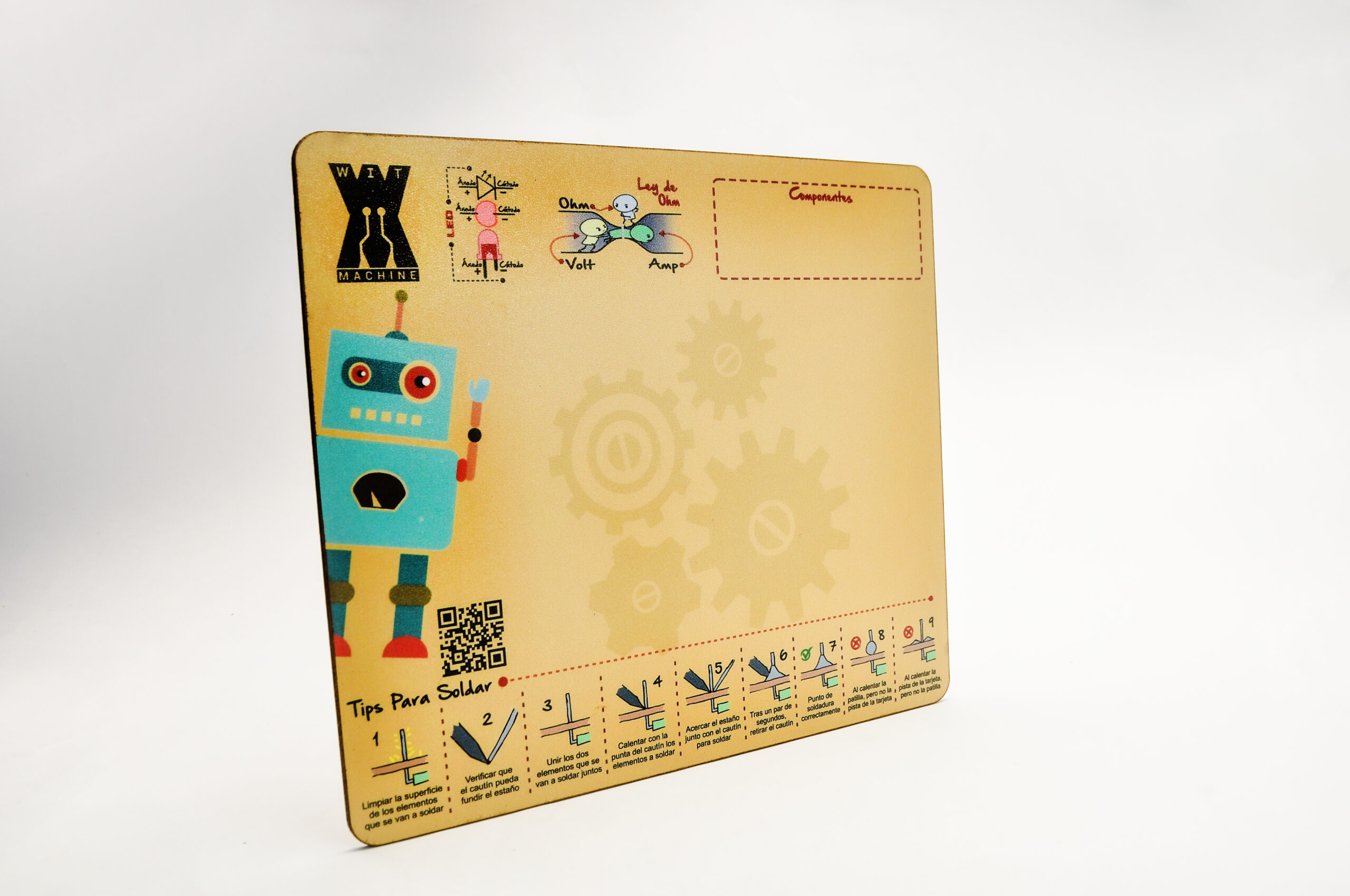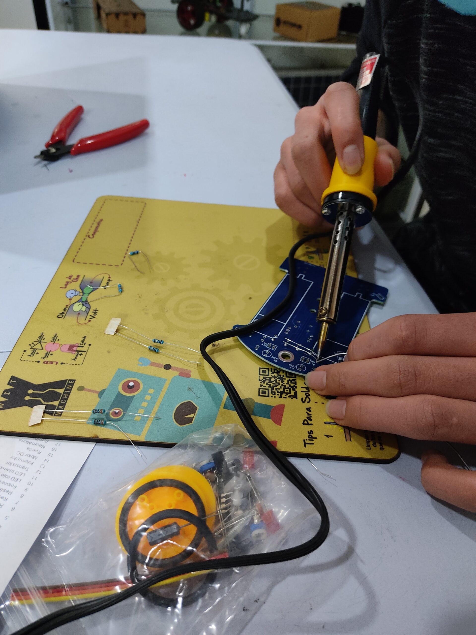 Área de trabajo el cual contiene tips para soldar, espacio para colocar componentes electrónicos.